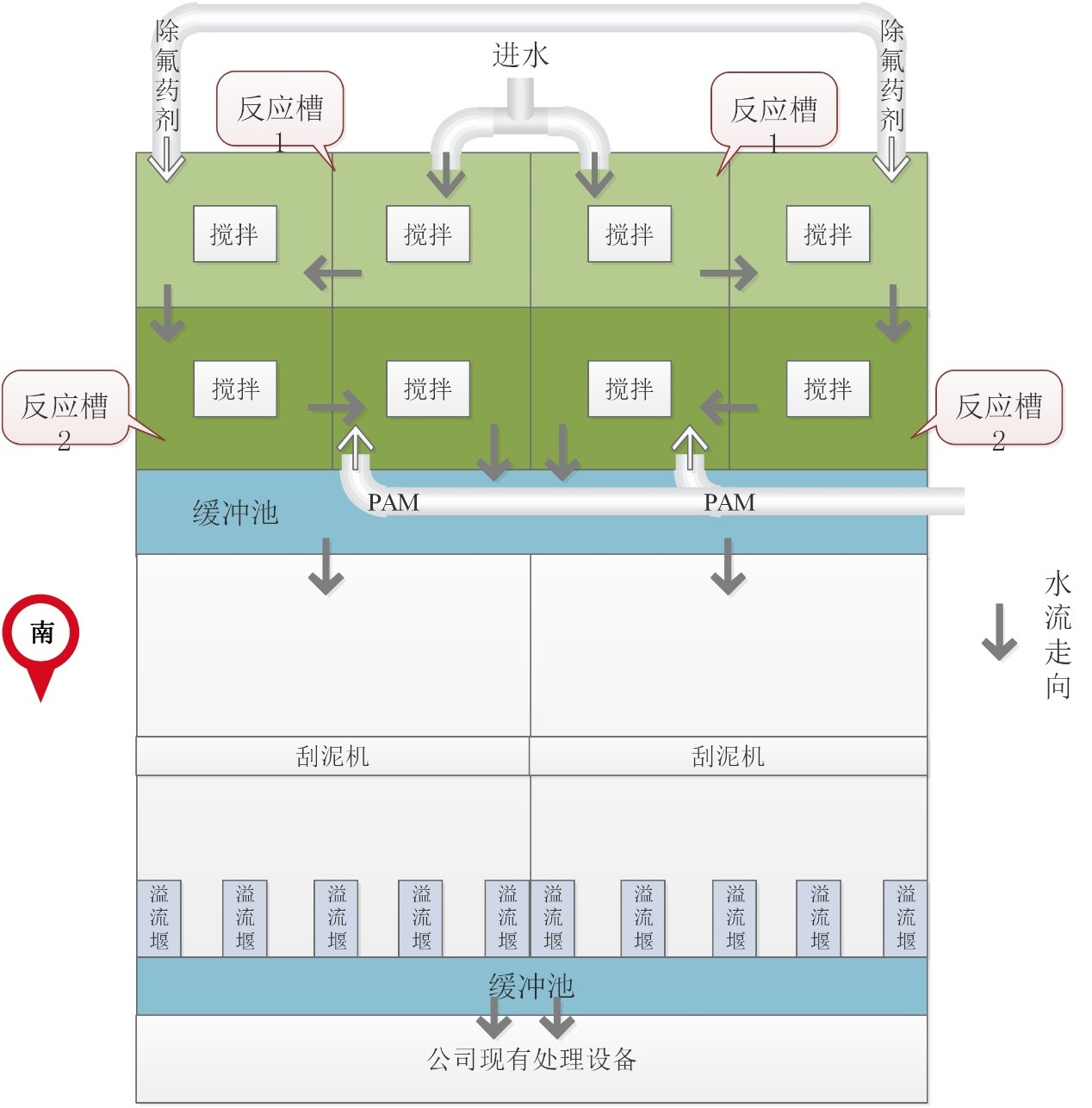 根據該企業廢水特點,經研究采用沉淀處理工藝,高效除氟劑GMS-F2+高效除氟劑GMS-F6,其工藝是經過大量現場經驗總結而來,處理成本低,處理效果好,出水穩定達標。