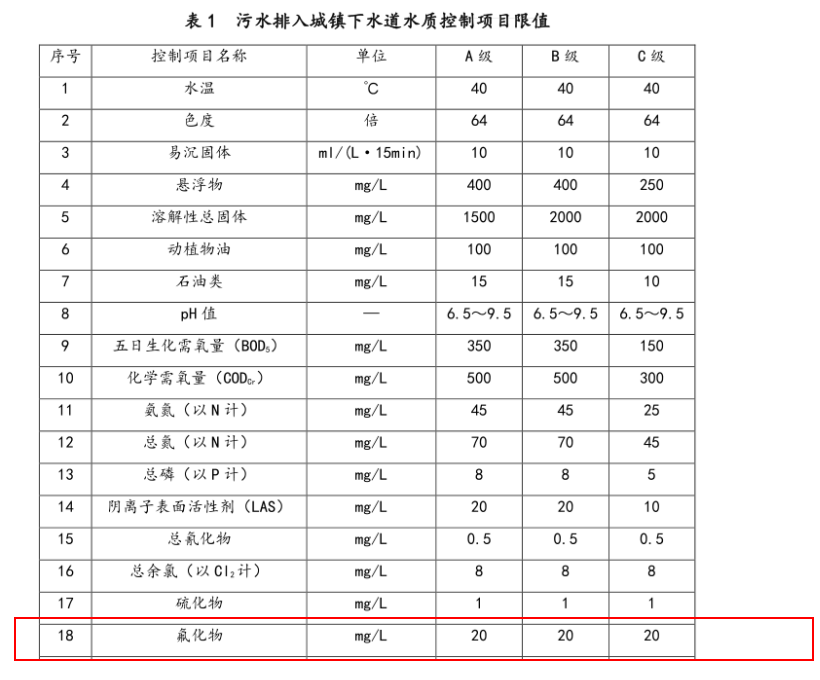 因此國(guó)家對(duì)含氟廢水的排放和生活引用水的最高含氟量有嚴(yán)格標(biāo)準(zhǔn),根據(jù)《污水排入城鎮(zhèn)下水道水質(zhì)標(biāo)準(zhǔn)》(GB/T31962-2015A 級(jí)標(biāo)準(zhǔn),廢水排放氟離子應(yīng)小于 20mg/L,根據(jù)《生活飲用水衛(wèi)生標(biāo)準(zhǔn)》(GB5749-2006),飲用水中氟離子不得高于 1mg/L