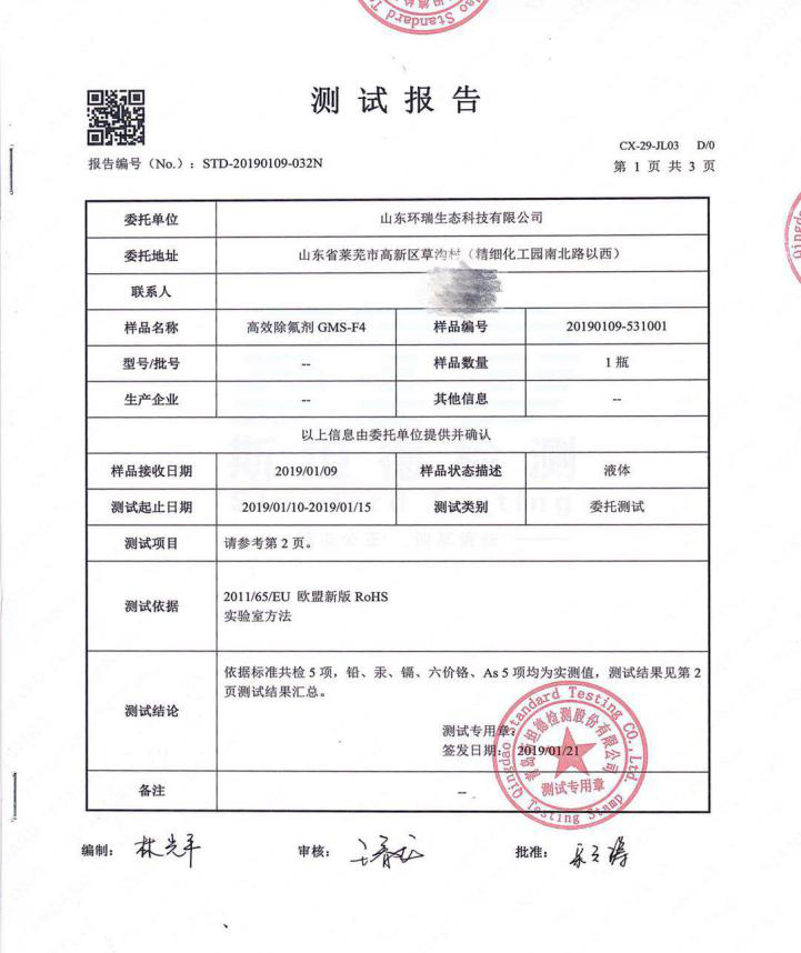 山東環(huán)瑞生態(tài)的除氟劑,每一個產(chǎn)品都有自己的第三方檢測報告,使用起來安全、可靠,產(chǎn)品質(zhì)量有保障