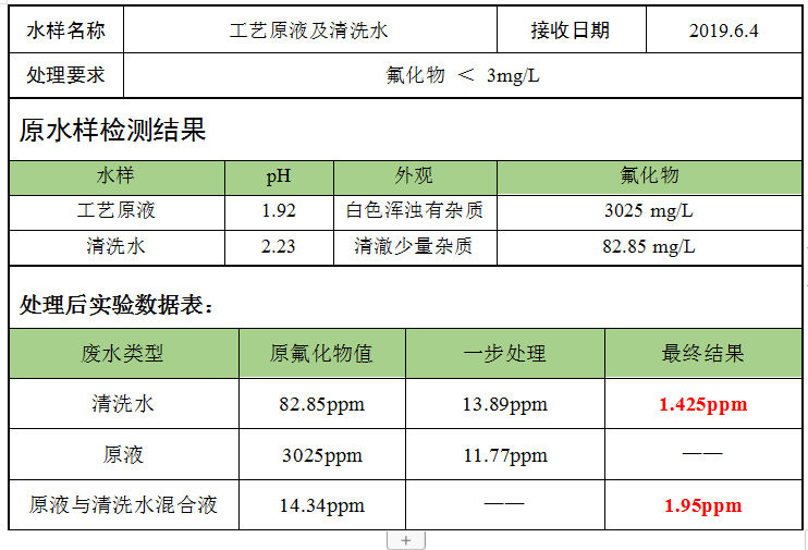通過除氟劑廠家-山東環瑞生態的實驗數據可以看出,使用環瑞生態的高效除氟劑可以將清洗水以及原液中的氟化物去除到較低的濃度,無需添加其他設備,去除率高達95%